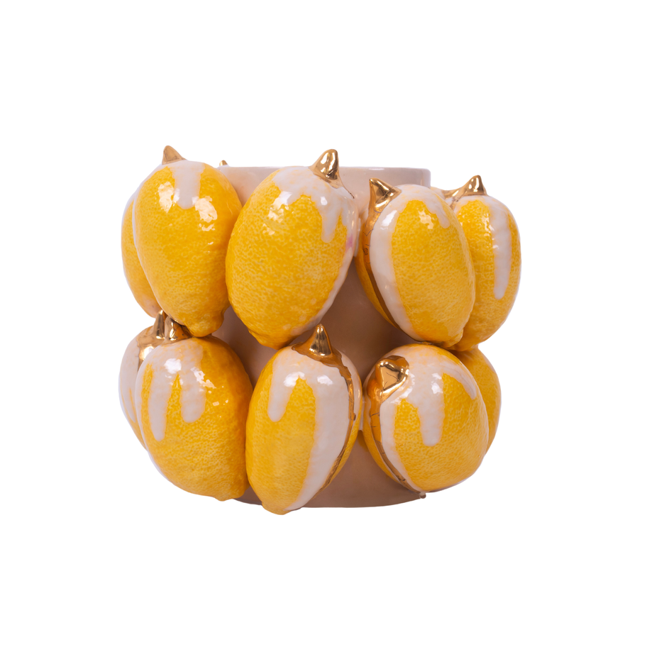 Bring a touch of the Mediterranean to your home with the Gold-Accented Lemon Vase from the Lemons to Legacy collection. This elegant piece features lifelike lemons, meticulously crafted from ceramic clay and adorned with a stunning gold glaze. The intricate hand-shaping process ensures each lemon has its unique texture and charm. Perfect for both indoor and outdoor decor, this vase adds a vibrant and luxurious element to any setting. Ideal for showcasing flowers or standing alone as a statement piece. This vase is suitable for holding water.